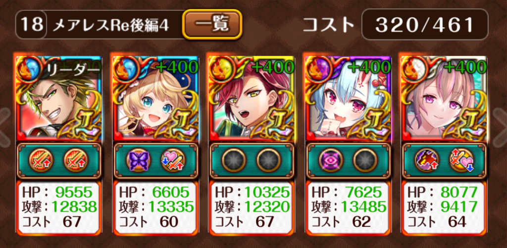 ・融合強化クレティアと複属性封印強化は対して強化率が変わらない。そして、敵のHPが低いなら逆襲スキチャが刺さりやすいので、この編成になりました。